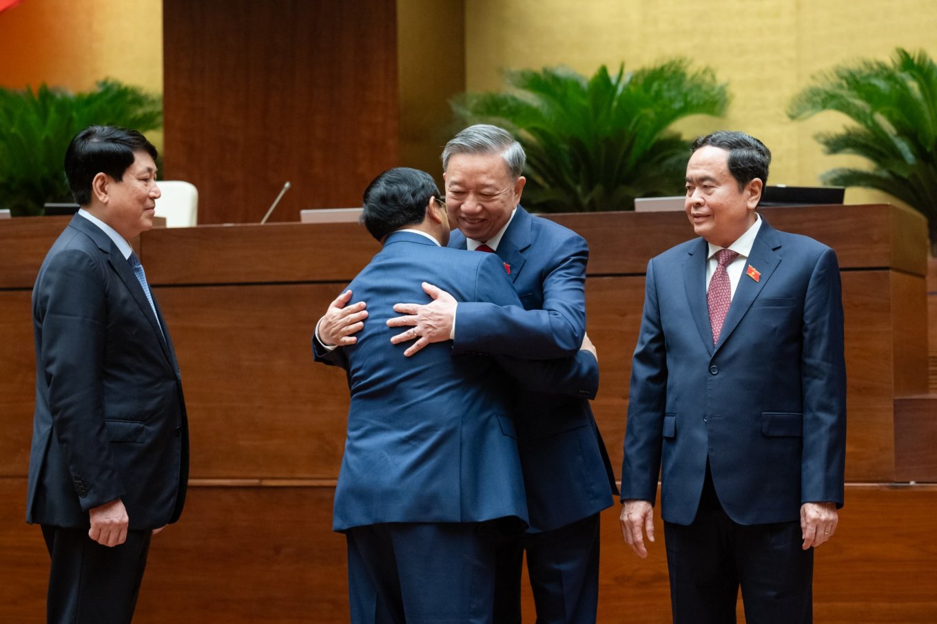 Thủ tướng Phạm Minh Chính ôm chúc mừng tân Chủ tịch nước Tô Lâm, bên phải là Chủ tịch Quốc hội Trần Thanh Mẫn, bên trái là Thường trực Ban Bí thư Lương Cường. Ảnh: Hoàng Phong