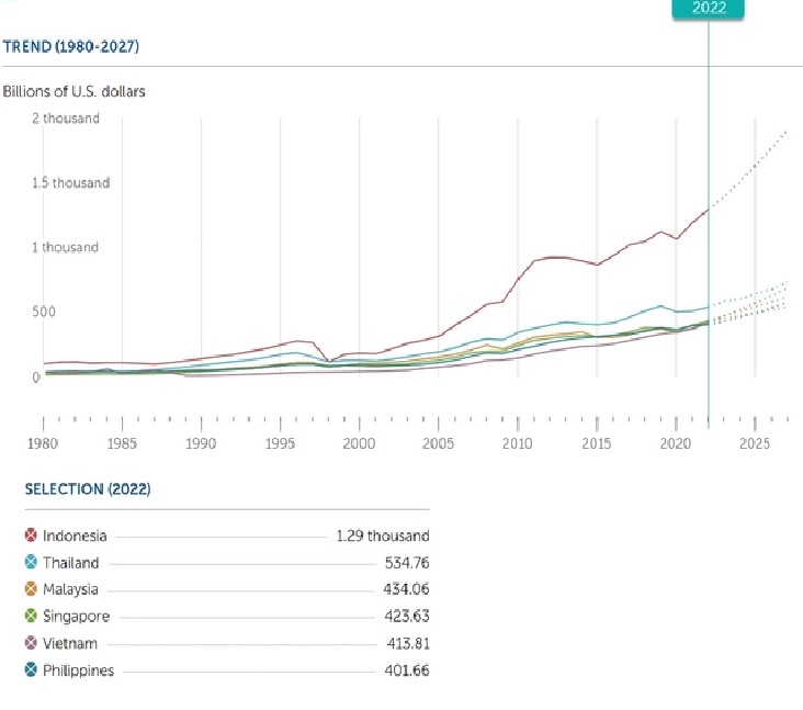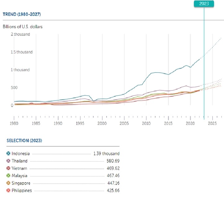 Theo IMF, năm 2023, Việt Nam sẽ đứng thứ ba Đông Nam Á về quy mô kinh tế. Cụ thể, GDP đạt 469,62 tỷ USD, tăng trưởng 6,2%. Việt Nam xếp sau Indonesia (1.390 tỷ USD, tăng trưởng 5%) và Thái Lan (580,69 tỷ USD, tăng trưởng 3,7%). Việt Nam vượt qua Malaysia (467,46 tỷ USD, tăng trưởng 4,4%), Singapore (447,16 tỷ USD, tăng trưởng 2,3%), Philippines (425,66 tỷ USD, tăng trưởng 5%). Khi đó, Việt Nam sẽ là quốc gia có quy mô kinh tế lớn thứ 35 thế giới, Malaysia và Singapore lùi xuống đứng thứ 36 và 37.